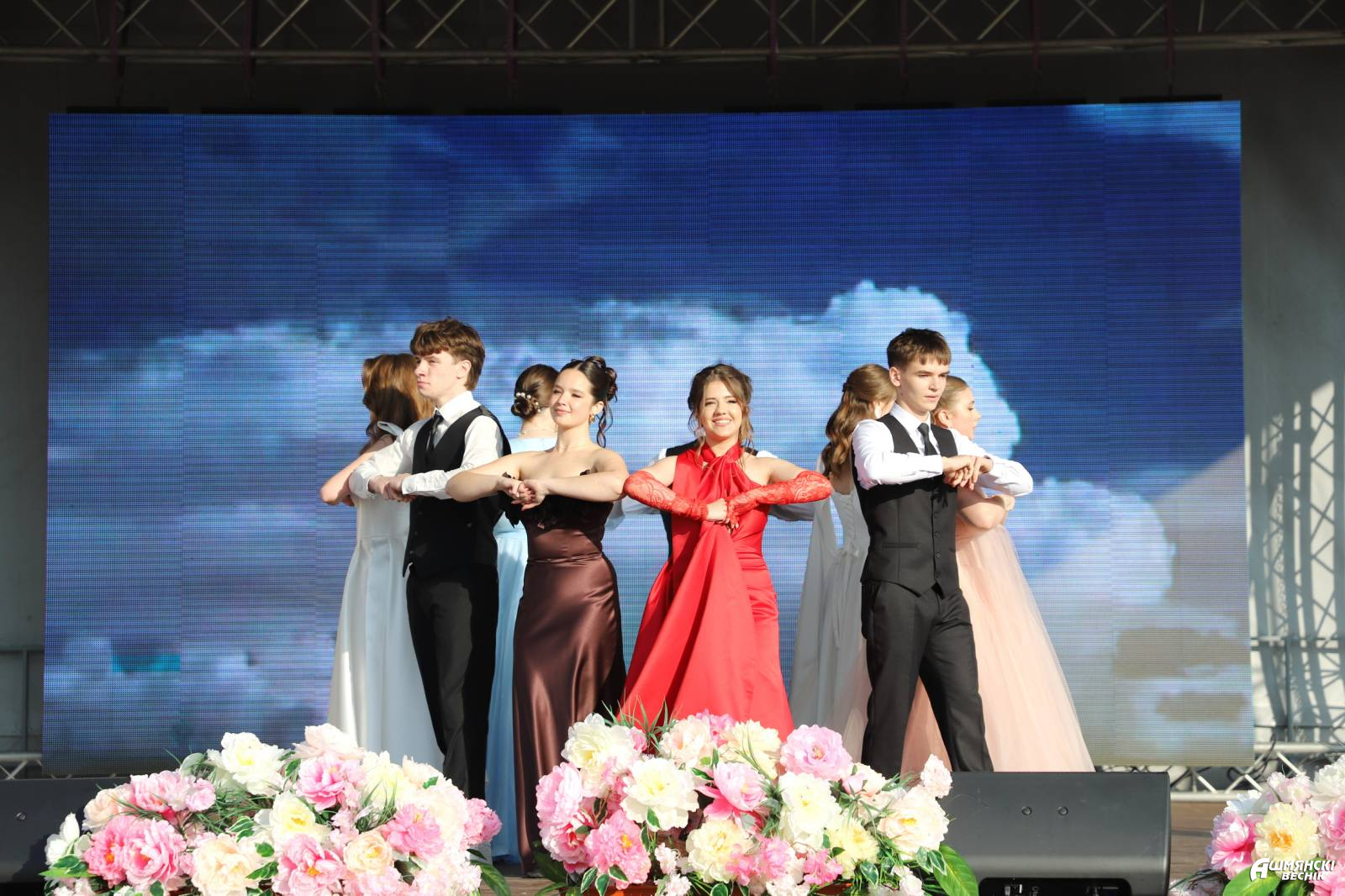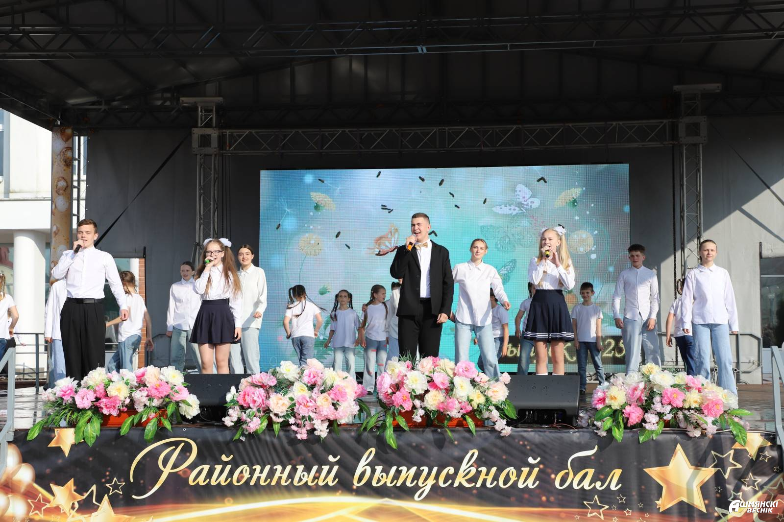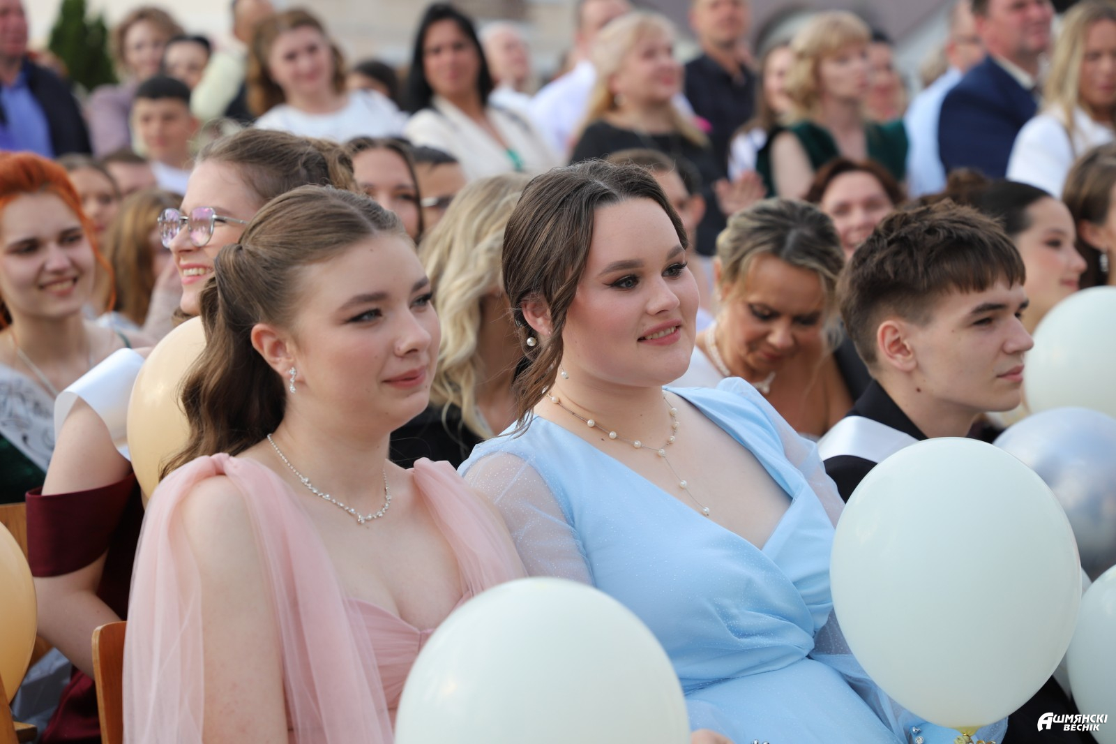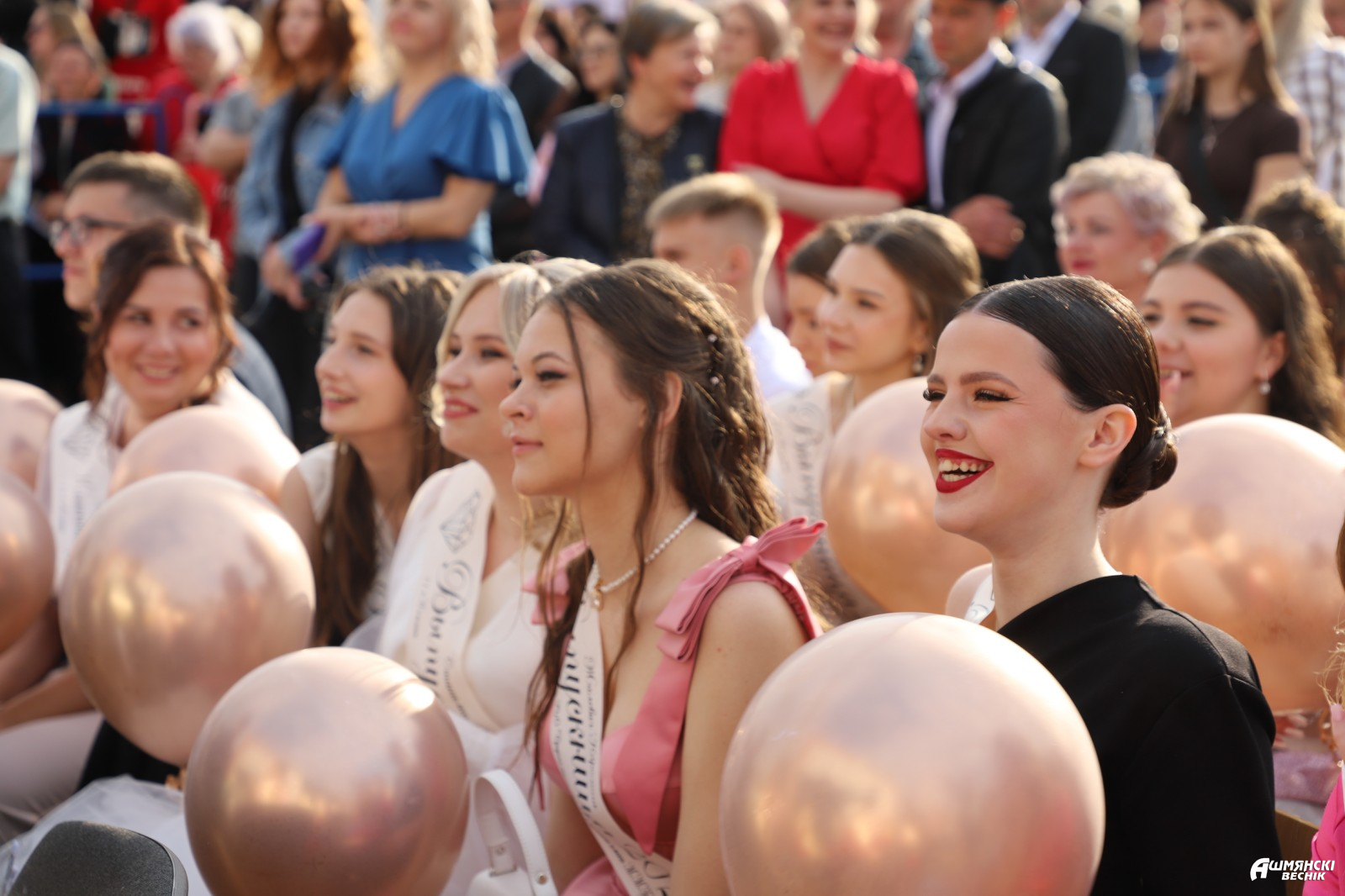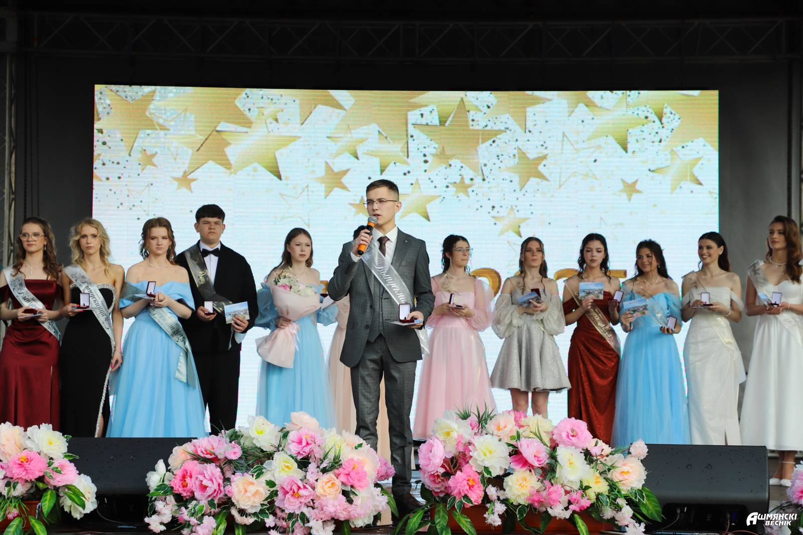 Выпускники раскрасили городскую площадь разноцветьем праздничных нарядов, ослепительными улыбками, юностью и энергией. Бурными овациями встречали ошмянцы каждый выпускной класс.