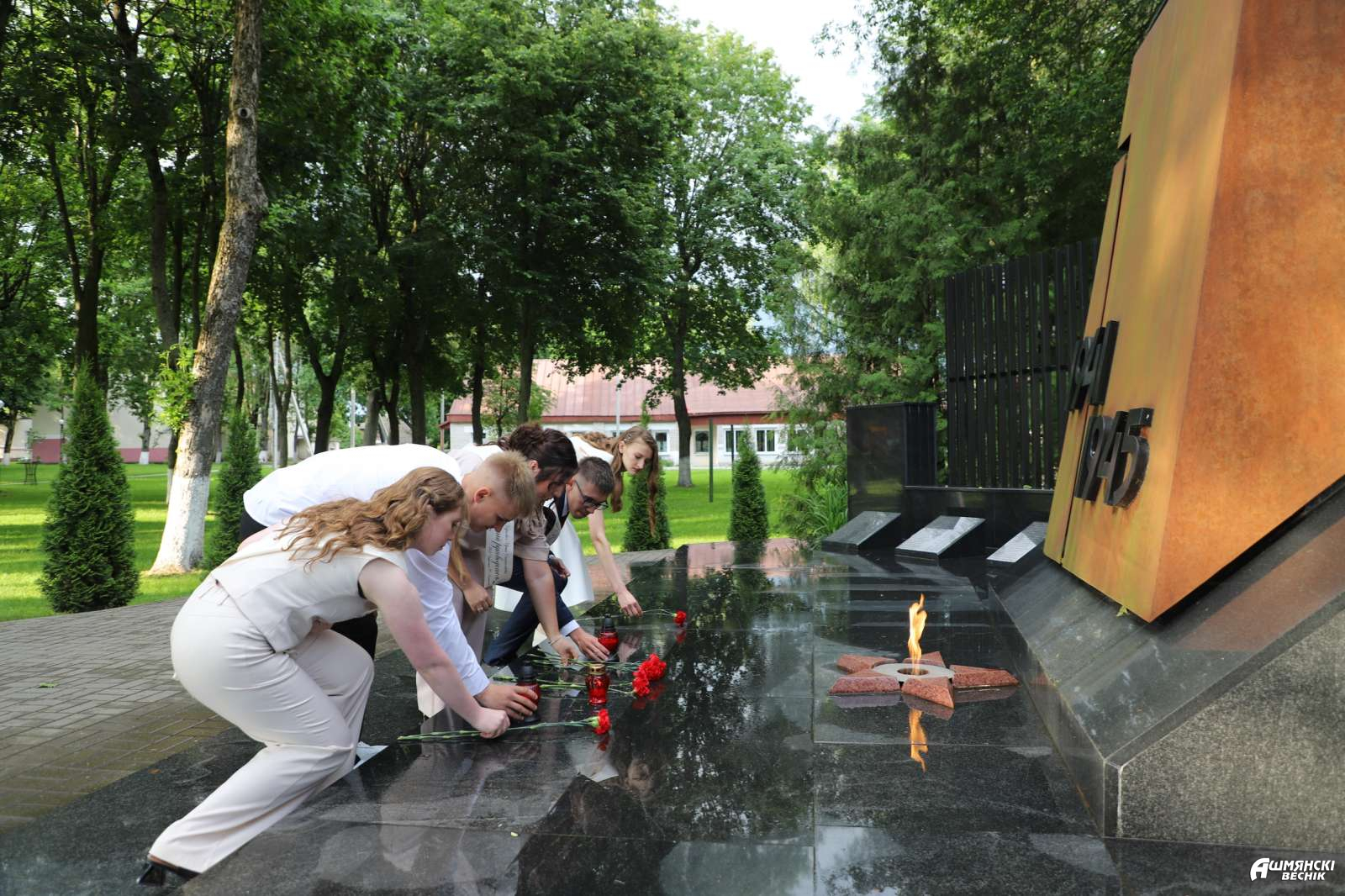 В год 80-летия Великой Победы юноши и девушки возложили цветы к братской могиле в городском парке.