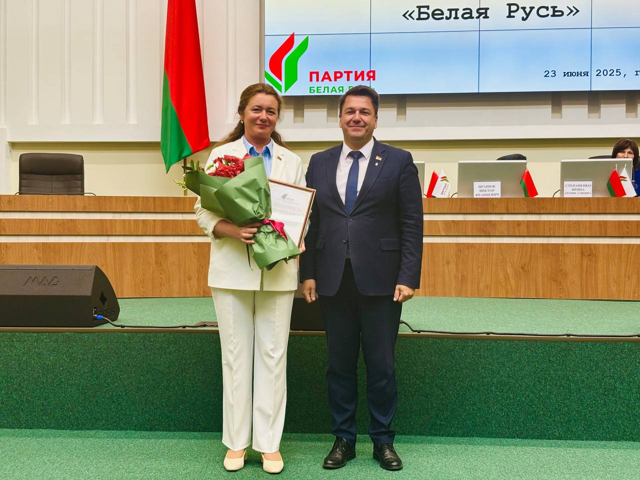 В завершение III отчетно-выборной конференции Гродненского областного отделения Белорусской партии «Белая Русь» состоялась церемония награждения активистов партийного строительства. За активное участие в общественно-политической деятельности и значительный вклад в развитие партийного строительства Гродненской области Почетная грамота вручена начальнику управления образования Ошмянского райисполкома Светлане Барковской.