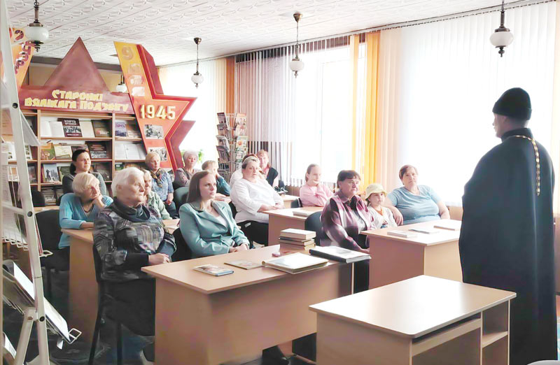 С читателями старшего поколения состоялся разговор «Поиск смысла жизни в зрелом возрасте». В процессе общения отец Владимир ответил на вопросы, волнующие присутствующих: о смысле жизни человека, путях спасения от одиночества, возможности принести пользу стране, людям. Библиотекари рассказали, как можно разнообразить жизнь с помощью книг, сделав обзор новинок литературы.