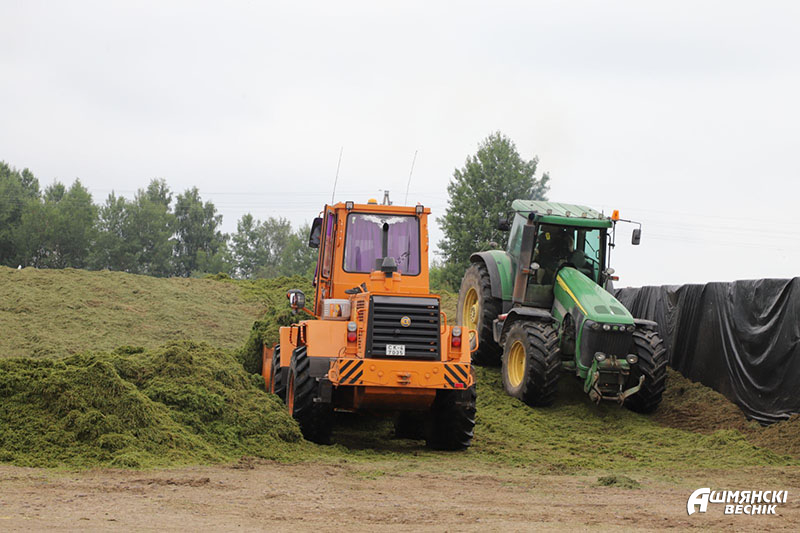 Следам за трактарам накіроўваемся ў Навасяды, да сянажнай траншэі. Здалёк чуцен гул тэхнікі. Пасля таго як з сенажаці дастаўляецца зялёная маса, дзвюма адзінкамі магутнай тэхнікі вядзецца трамбоўка. Кантралюе закладку аграном-хімік Людміла Юкша. Некалькі разоў на дзень малады спецыяліст вызначае тэмпературу закладзенай масы — яна не павінна перавышаць 30 °С. Усе дадзеныя — батанічны склад траў, пачатак закладкі траншэі, фаза вегетацыі раслін, ступень здрабнення масы, вільготнасць, тэмпература, звесткі пра кансервант — заносяцца ў акт кантролю якасці нарыхтоўкі. Спецыяліст ведае, што ўборка траў на сянаж прамым камбайнаваннем, без папярэдняга правяльвання, недапушчальна. Пасля таго як траву скасілі, яна павінна падсохнуць да вільготнасці 55-60 %. У якасці кансерванту выкарыстоўваецца «Фідграс».