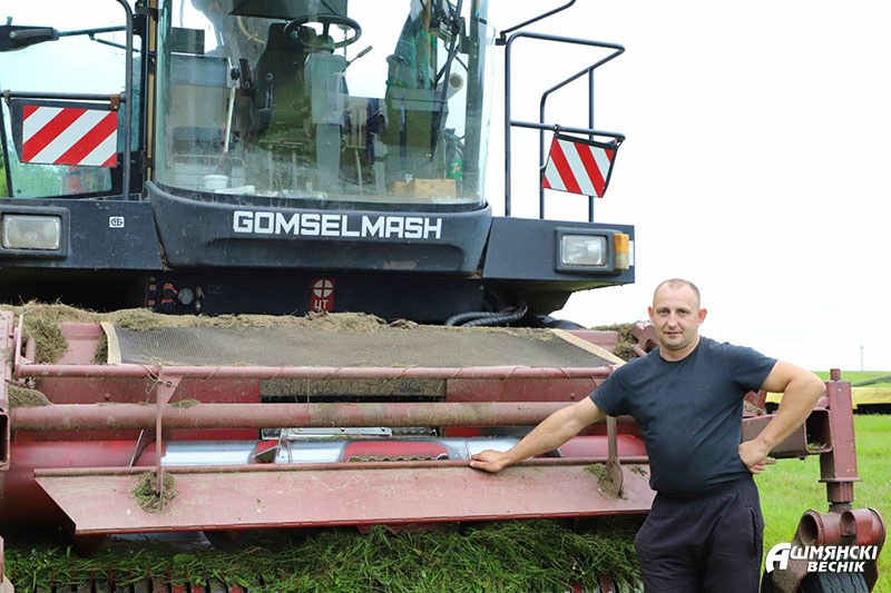 Упэўнена кіруе корманарыхтоўчым камбайнам Аляксей Тарасевіч, для якога сёлета шостая касавіца. За дзень, адзначае механізатар, атрымліваецца нарыхтаваць 350 — 400 тон травяных кармоў.