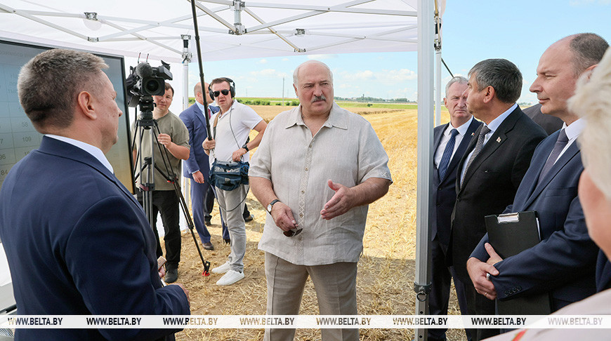 Президент Беларуси Александр Лукашенко в полях инспектирует ход уборочной кампании. Глава государства работает в Смолевичском районе Минской области, передает корреспондент БЕЛТА.