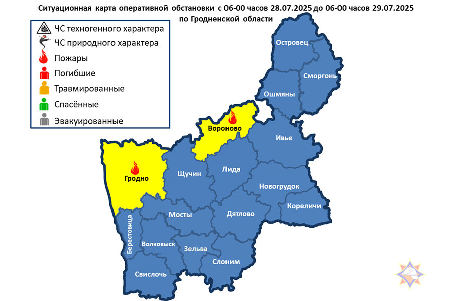 За сутки подразделениями МЧС области совершен 51 выезд, из них: 2 – пожара: г. Гродно (Октябрьский район) – пожар холодильной витрины; Вороновский район – пожар жилого дома. Люди не пострадали.