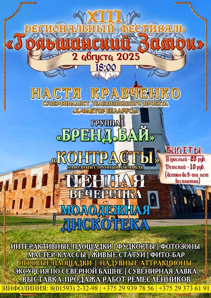В программе: выступление народного струнного ансамбля «Контрасты», группы Бренд.Бай». Хедлайнером фестиваля станет суперфиналист телевизионного проекта «Х-фактор Беларусь», представитель Беларуси на конкурсе «Интервидение 2025» — Настя Кравченко.