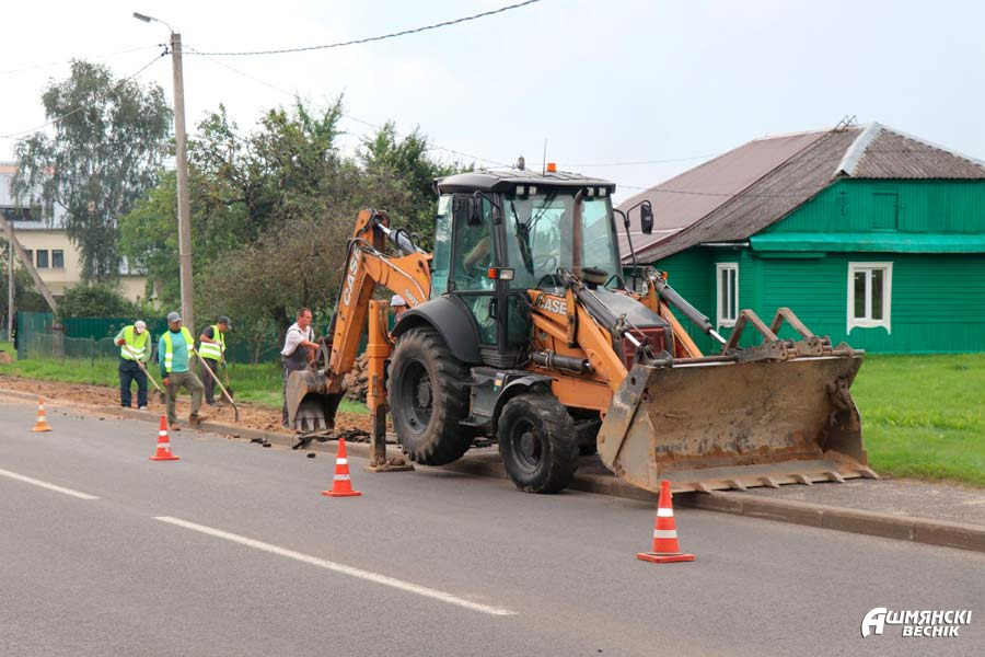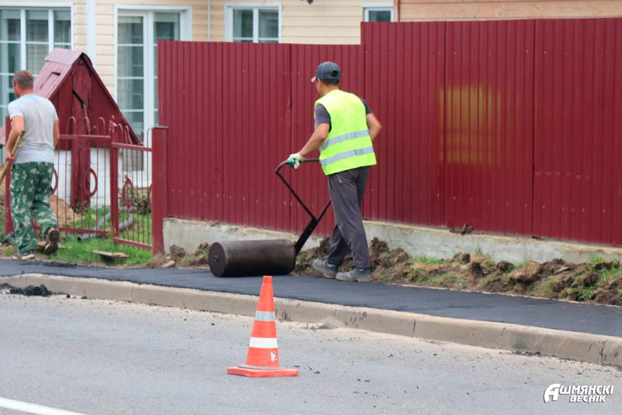 На участке улицы Красноармейской в городе Ошмяны будет новое тротуарное покрытие. Старое асфальтовое тротуарное покрытие демонтируется. Производится подсыпка и выравнивание песчаного слоя, его трамбовка. Сейчас идут работы по укладке нового тротуара из асфальта. Длина участка, на котором будет заменено покрытие, около 600 метров.