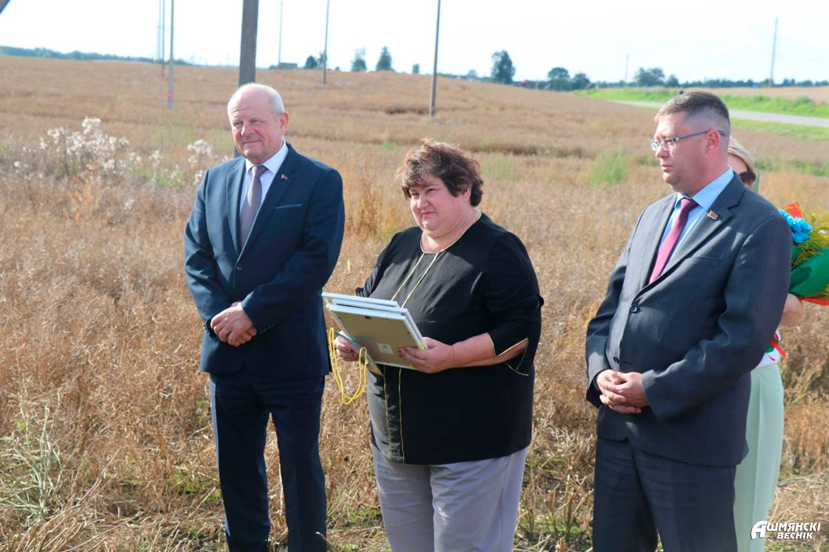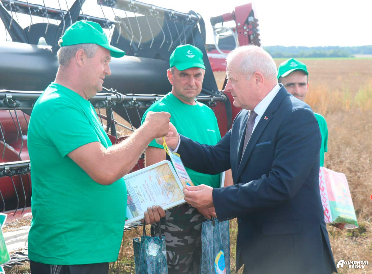 Поздравить передовиков и поблагодарить за честный многолетний труд и высокую самоотдачу прямо на рапсовое поле выехали первый заместитель председателя Ошмянского райисполкома Андрей Янюк, лидер профсоюза аграриев Гродненщины Михаил Ситько, председатель Ошмянского райкома профсоюза работников АПК Раиса Турлай, директор КСУП «Гольшаны» Михаил Скаржинский.
