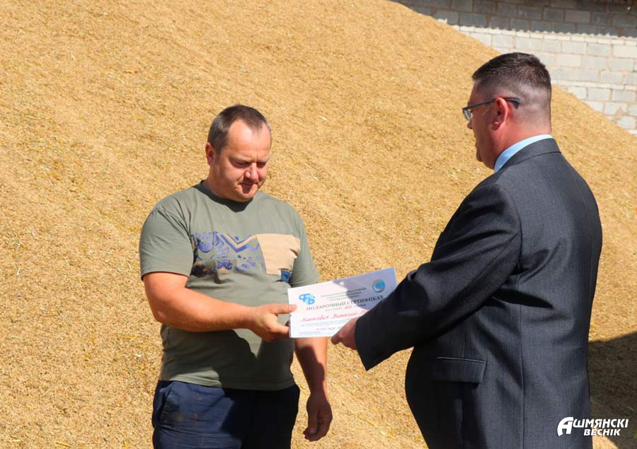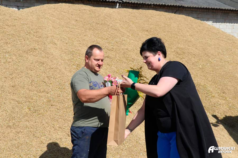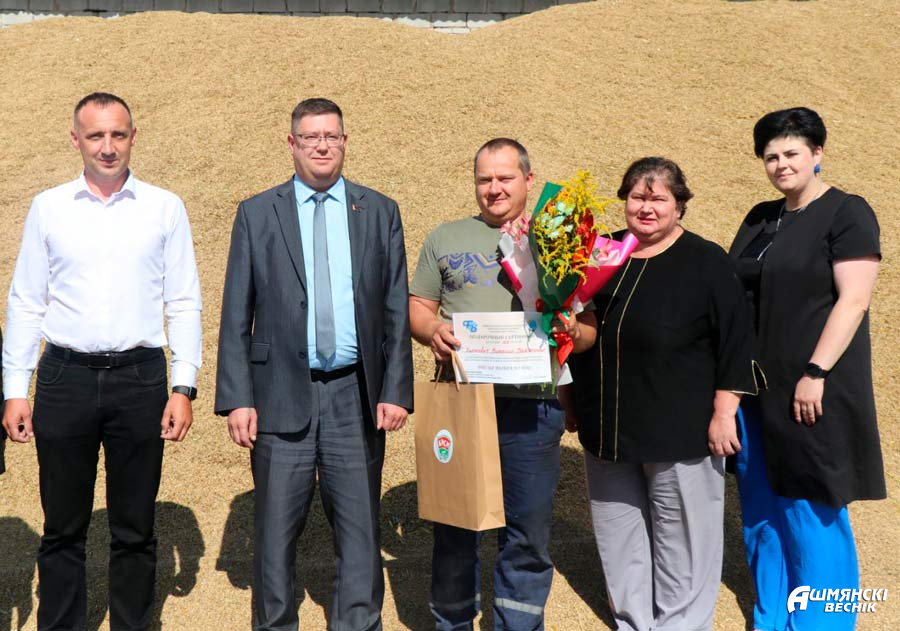 Виталий Блажевич принимал поздравления от первого заместителя председателя Ошмянского райисполкома Андрея Янюка, председателя райкома профсоюза работников АПК Раисы Турлай, руководителя КСУП «Крейванцы» Алексея Чернявского и председателя профсоюзной первичной организации хозяйства Алеси Качан. К поздравлениям присоединилась и первый секретарь районного комитета ОО «БРСМ» Юлия Субач. В республике реализуется проект «Молодежь за урожай!», в рамках которого организованы соревнования среди молодежных экипажей комбайнеров и молодых водителей, перевезших наибольшее количество зерна.