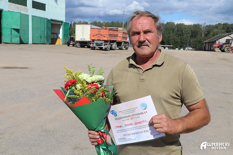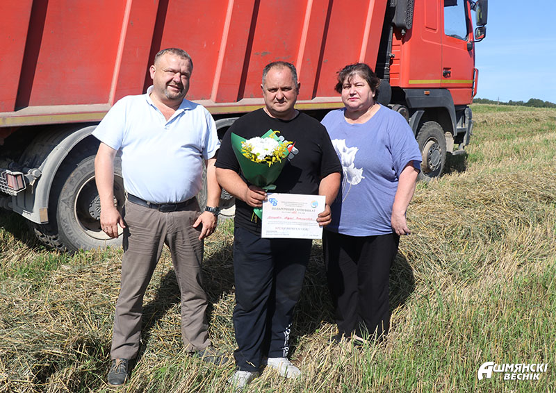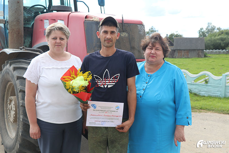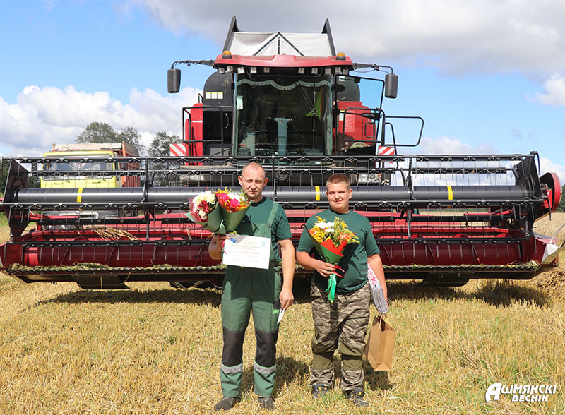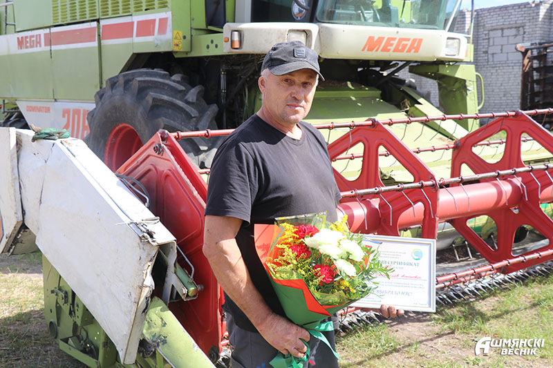 Первый заместитель председателя Ошмянского райисполкома – начальник райсельхозпрода Андрей Янюк вместе с председателем райкома профсоюза работников АПК Раисой Турлай выезжают в хозяйства, чтобы выразить механизаторам благодарность за труд и достигнутые успехи. К поздравлениям присоединяются руководители и председатели профсоюзных первичных организаций хозяйств. Дипломы, подарочные сертификаты, цветы и подарки вместе с теплыми словами благодарности механизаторы принимают с признательностью и достоинством — их труд отмечен – и с новыми силами спешат к своим машинам. Жатва в районе идет активными темпами, не за горами – и двухтысячные намолоты.