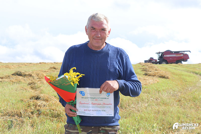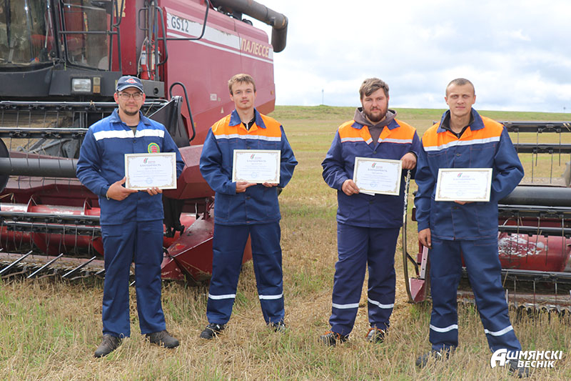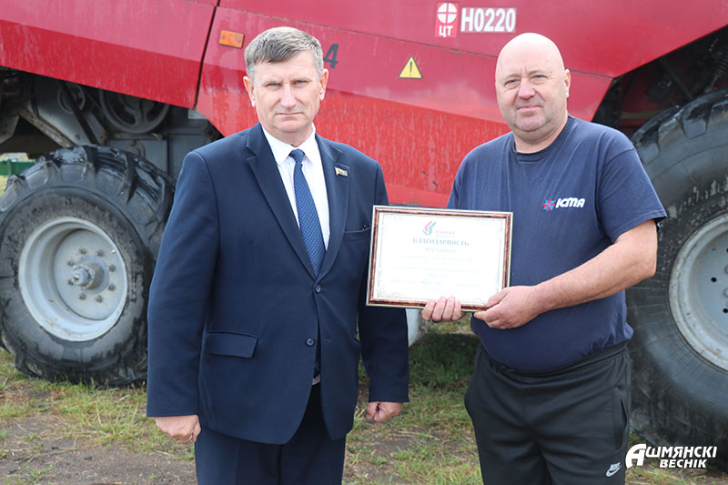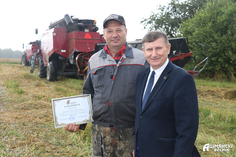 К поздравлениям аграриев присоединились районный Совет депутатов и районное отделение партии «Белая Русь» в лице председателя Совета районного отделения партии, председателя Ошмянского районного Совета депутатов Юрия Карповича. За ответственное отношение к работе, активное участие в уборочной кампании Юрий Михайлович вручил благодарности и денежные сертификаты комбайнерам Антону Спиридовичу из СУП «АгроГроди», Станиславу Суровцу, Геннадию Трахневичу и Сергею Шаблавинскому из КСУП «Краковка».