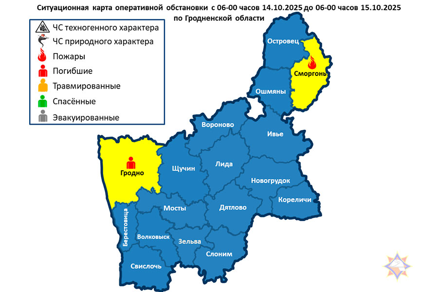 За сутки подразделениями МЧС области совершен 21 выезд, из них: 1 – пожар: Сморгонский район – пожар бани. В учреждении здравоохранения скончался 1 человек, спасенный на пожаре 13.10.2025 в г. Гродно.