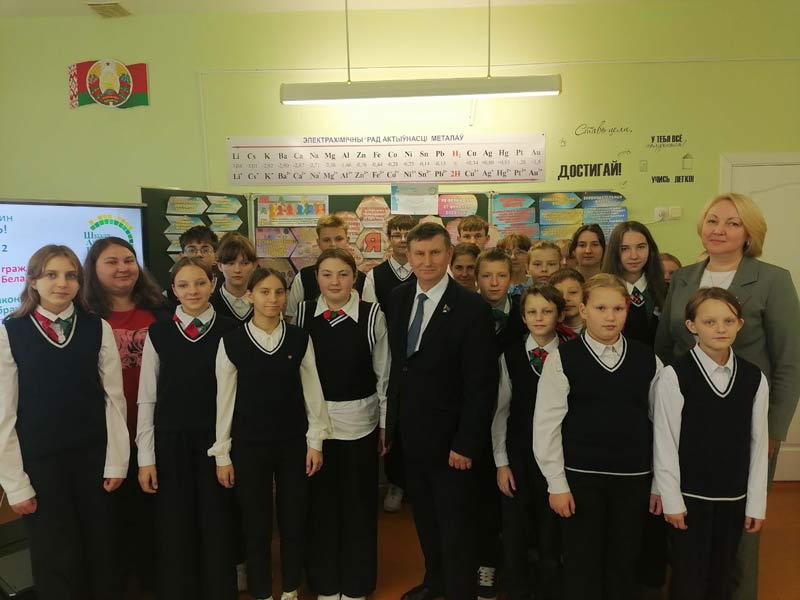 В Борунской школе во встрече приняли участие старшеклассники, педагоги и почетный гость – председатель районного Совета депутатов, председатель Совета Ошмянского районного отделения Белорусской партии «Белая Русь» Юрий Карпович. Юрий Михайлович поделился с учащимися своим опытом общественной и политической деятельности, рассказал о значении гражданской ответственности и уважении к законам. Он подчеркнул, что достойный гражданин – это не просто статус, а ежедневный выбор: быть честным, трудолюбивым, уважать других и заботиться о будущем своей страны. Гость отметил, что гражданственность начинается с малого – с уважения к педагогам, семье, родной земле.