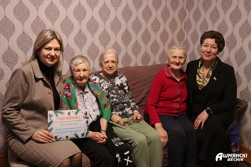 В рамках акции «От всей души» в гости к ним пришли депутат районного Совета депутатов, делегат Всебелорусского народного собрания, управляющая центром по обеспечению деятельности бюджетных организаций и государственных органов Лилия Неверкевич, начальник центра банковских услуг № 429 г. Ошмяны региональной дирекции по Гродненской области ОАО «Белагропромбанк» Александра Гаевская, начальник сектора корпоративного бизнеса центра банковских услуг № 429 г. Ошмяны ОАО «Белагропромбанк» Надежда Габриялович, директор ТЦСОН Ошмянского района Наталья Тихонович и волонтеры серебряного возраста отделения дневного пребывания для граждан пожилого возраста.