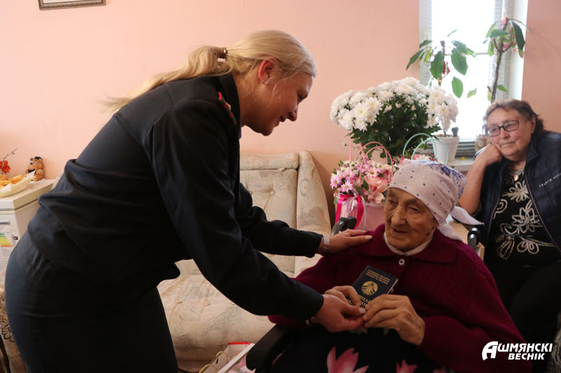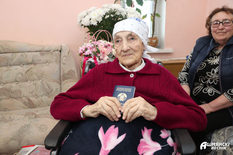 Далучыліся да віншаванняў старшыня Ашмянскага райкама прафсаюза работнікаў АПК Раіса Турлай, начальнік упраўлення па працы, занятасці і сацыяльнай абароне райвыканкама Ірына Губарава, дырэктар ТЦСАН Ашмянскага раёна Наталля Ціхановіч. У знакавы дзень атрымала Леанарда Казіміраўна і галоўны дакумент грамадзяніна Рэспублікі Беларусь – пашпарт, які з гонарам ёй уручыла начальнік аддзялення па грамадзянству і міграцыі Ашмянскага РАУС Анастасія Хількевіч. Сведкамі гэтай падзеі сталі дзеці, унукі і праўнукі юбіляркі.
