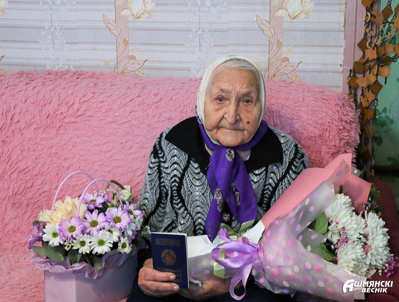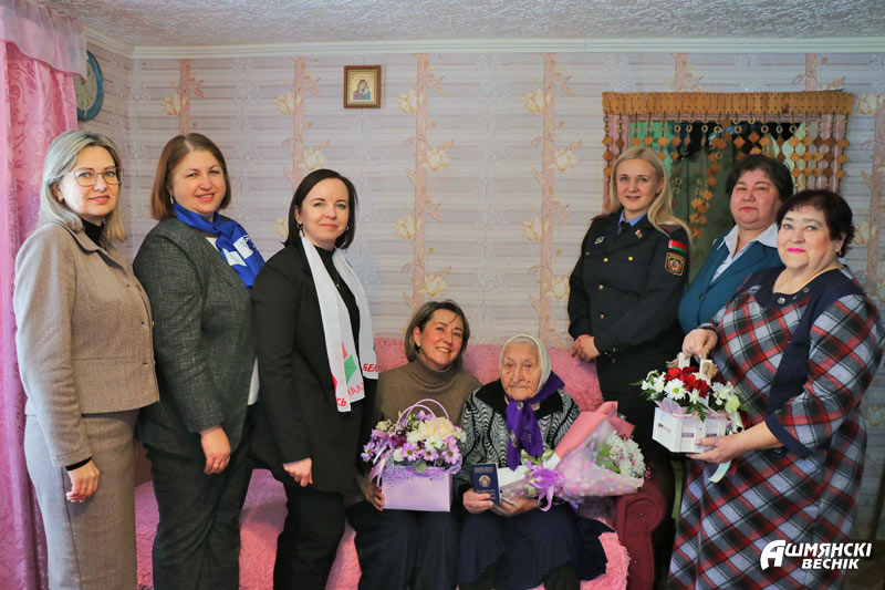 В свой день рождения Янина Абрамович принимала поздравления не только от близких, родных и знакомых, но и от руководства района, лидеров общественных организаций. Поздравить женщину с юбилеем и выразить благодарность за неоценимый труд на благо родного края приехали заместитель председателя райисполкома, председатель районной организации ОО «Белая Русь» Анна Язель, председатель Ошмянского райкома профсоюза работников АПК Раиса Турлай, начальник управления по труду, занятости и социальной защите райисполкома Ирина Губарева, директор ТЦСОН Ошмянского района Наталья Тихонович. Начальник отделения по гражданству и миграции Ошмянского РОВД Анастасия Хилькевич вручила Янине Стефановне в ее сотый день рождения новый главный документ гражданина Республики Беларусь – паспорт.