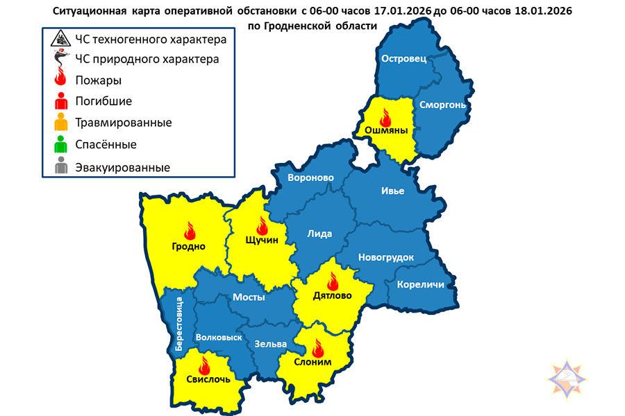 За сутки подразделениями МЧС области совершено 33 выезда, из них: 6 – на пожары: Гродненский район – пожар жилого дома; г. Слоним– пожар легкового автомобиля; Дятловский район – пожар хозяйственной постройки; Свислочский район – пожар жилого дома; Ошмянский район – пожар жилого дома; Щучинский район – пожар хозяйственной постройки. Люди не пострадали.