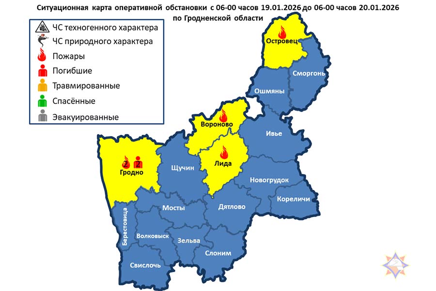 За сутки подразделениями МЧС области совершено 29 выездов, из них: 5 – на пожары: Гродненский район – пожар жилого дома, погибли 2 человека; Вороновский район – пожар в квартире; Лидский район – пожар хозяйственной постройки; г. Островец – пожар в общежитии; г. Гродно (Октябрьский район) – пожар легкового автомобиля.