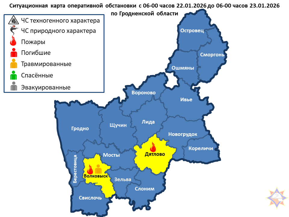 За сутки подразделениями МЧС области совершено 27 выездов, из них: 2 – на пожары: Волковысский район – пожар жилого дома, травмирован 1 человек; Дятловский район – пожар частной бани.