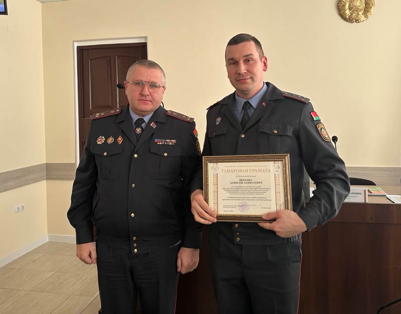 За добросовестную службу Грамотой Ошмянского райисполкома награжден инспектор ДПС отделения ГАИ Алексей Щелко. Благодарственным письмом Ошмянского райисполкома награжден старший оперуполномоченный по противодействию киберпреступности Максим Шидловский. Благодарность управления внутренних дел Гродненского облисполкома вручена оперуполномоченному отделения уголовного розыска Игорю Кузьме. Нагрудным знаком «За заслугі» награжден участковый инспектор милиции Дмитрий Черский, нагрудным знаком «80 лет УВД Гродненского облисполкома» награжден старший инспектор-дежурный оперативно-дежурной службы Иван Концевой.