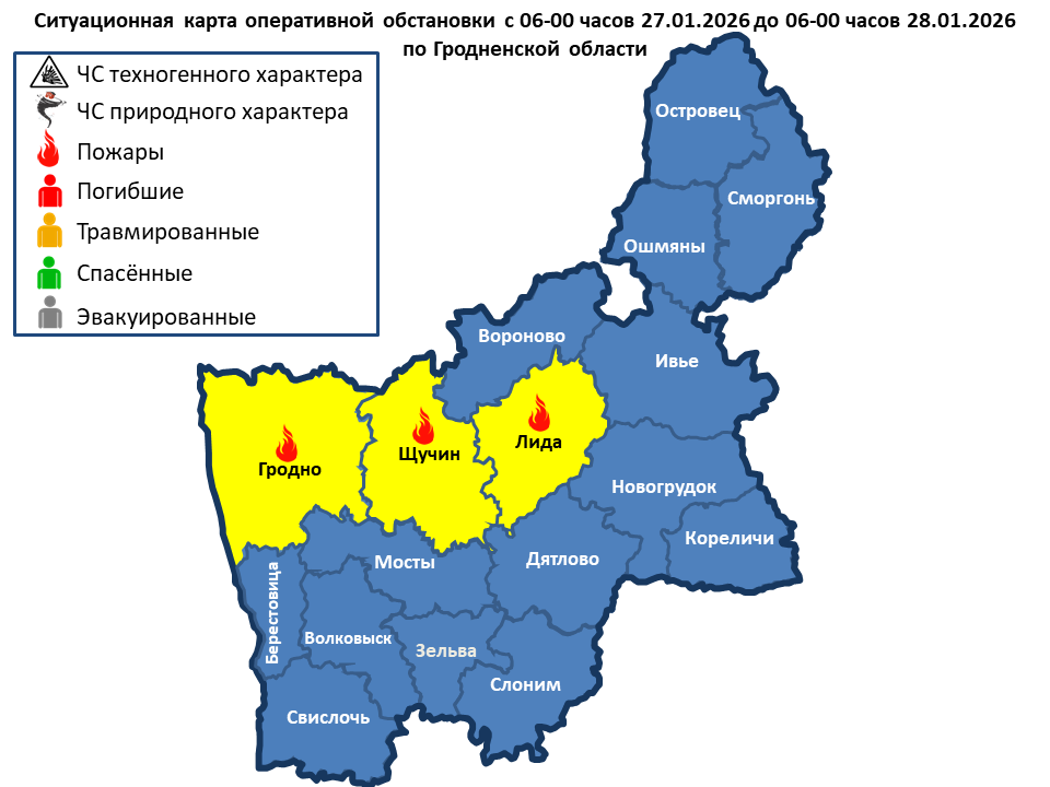 За сутки подразделениями МЧС области совершено 39 выездов, из них: 3 – пожара: Щучинский район – пожар в квартире. г. Лида – пожар в подвале. Гродненский район — пожар хозяйственной постройки. Люди не пострадали.
