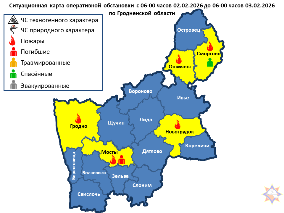 За сутки подразделениями МЧС области совершено 34 выезда, из них: 5 – пожаров: Сморгонский район – пожар жилого дома, в результате сработки АПИ спасен 1 человек; Гродненский район – пожар дачного дома; Мостовский район – пожар жилого дома, погиб 1 человек; Новогрудский район – пожар хозяйственной постройки; Ошмянский район – пожар гаража.
