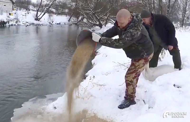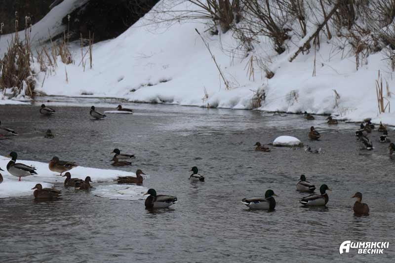 Страдают в большие морозы и птицы. Добывать пищу им становится все сложнее. Глубокий снег и низкие температуры значительно сокращают их шансы на выживание. Чтобы обеспечить необходимым питанием уток на реке Ошмянке в черте города специалисты Ошмянского охотничьего хозяйства регулярно подсыпают для них зерно на берегу реки за Борунским мостом на улице Франтишканской. Утки давно облюбовали эту часть реки. Но сейчас их там намного больше обычного. Птицы с удовольствием клюют зерно, однако людей к себе не подпускают. При первой же попытке приблизиться улетают, громко хлопая крыльями и крякая — предупреждая сородичей об опасности.