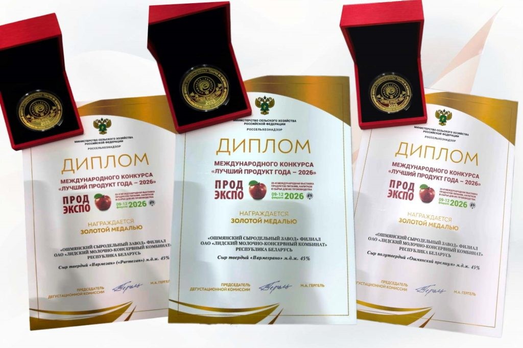 Продукция Ошмянского сыродельного завода в рамках Международного конкурса «Лучший продукт года — 2026» была удостоена трех золотых медалей.