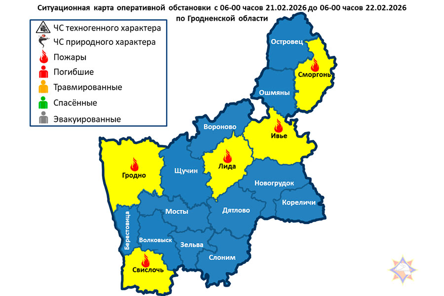 За сутки подразделениями МЧС области совершено 24 выезда, из них: 5 – на пожары: Гродненский район – пожар частной бани; Лидский район – пожар частной бани; Сморгонский район – пожар частной бани; Свислочский район – пожар хозяйственной постройки; Ивьевский район – пожар хозяйственной постройки. Люди не пострадали.