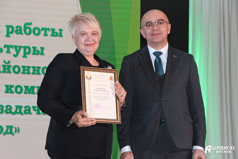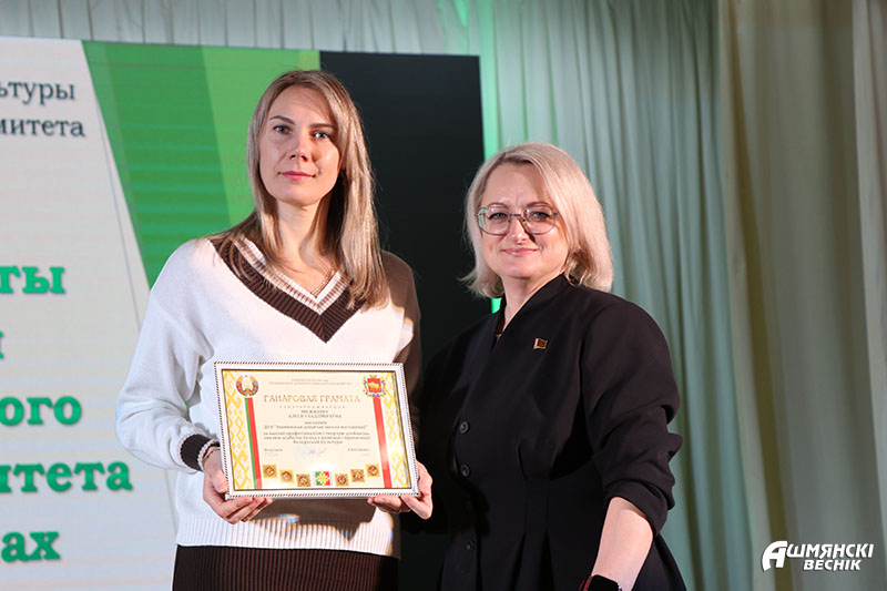 В завершение мероприятия состоялось награждение представителей учреждений культуры по итогам работы за год. Благодарственным письмом председателя Ошмянского районного исполнительного комитета награждена главный хранитель фондов Ошмянского краеведческого музея имени Ф.К. Богушевича Татьяна Кирковская, Почетной грамотой управления культуры Гродненского облисполкома — учитель Ошмянской детской школы искусств Алеся Мисюкевич.