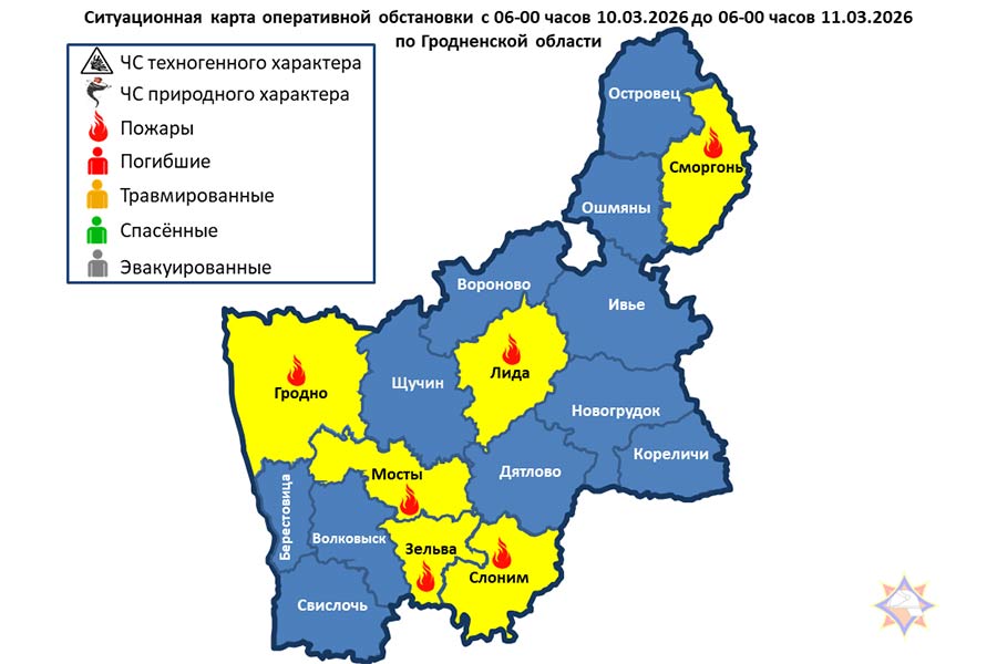 За сутки подразделениями МЧС области совершено 32 выезда, из них: 6 – пожаров: Лидский район – пожар гаража; г. Скидель – пожар частной бани; Мостовский район – пожар хозяйственной постройки; г. Слоним – пожар в неэксплуатируемом здании; г. Сморгонь – пожар легкового автомобиля; г.п. Зельва – пожар частной бани. Люди не пострадали.