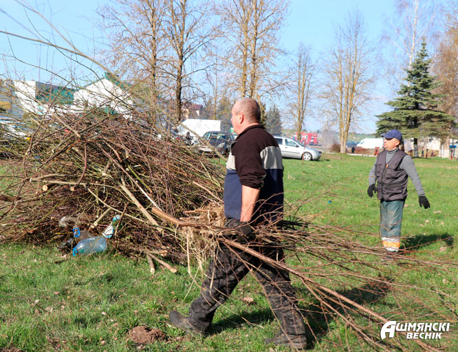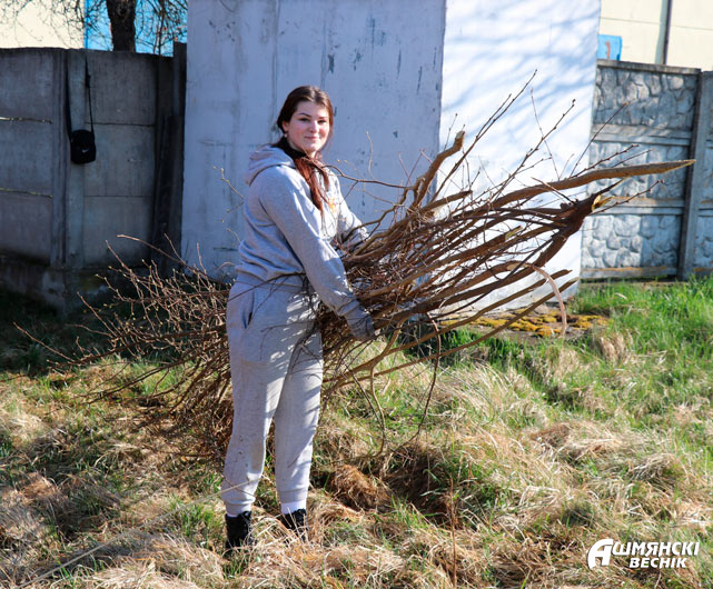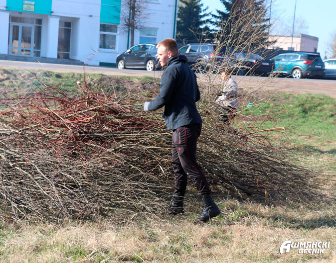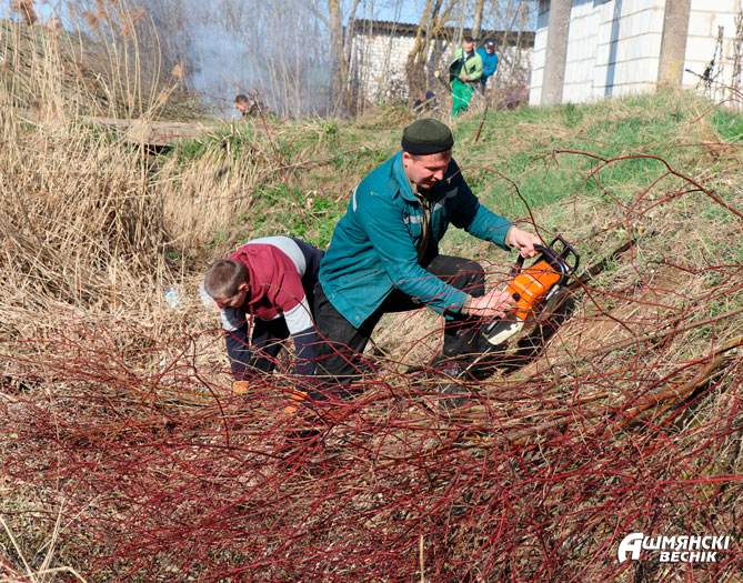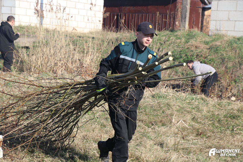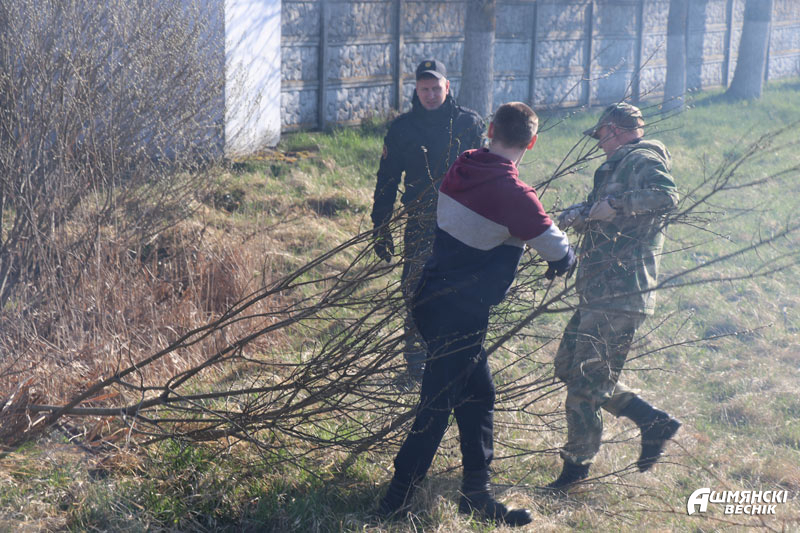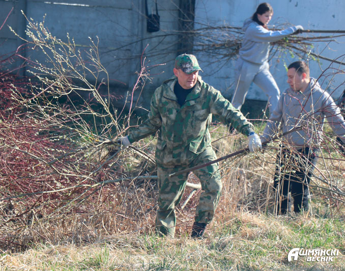 На улице Пионерской вдоль гаражей до пруда № 4 работают сотрудники РОЧС и коллектив ДСУ-28. Удаление древесно-кустарниковой растительности, выпиливание и уборка сучьев – главная задача спасателей на субботнике. Им навстречу от пруда № 4 идут работники дорожной организации. Работа идет в прямом и переносном смысле с огоньком.