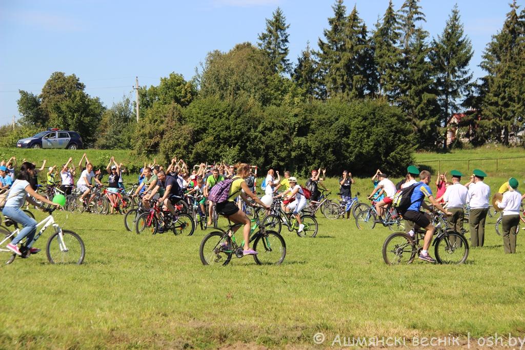 Продолжил мероприятие креативный велофлэшмоб, который состоялся на стадионе возле Жупранской средней школы. Под руководством Александра Рыдкина участники выстроились в фигуру велосипеда и под аккомпанемент военного оркестра Сморгонской пограничной группы отправились на фестиваль бардовской песни «В кругу друзей» в лагерь «Дружба».