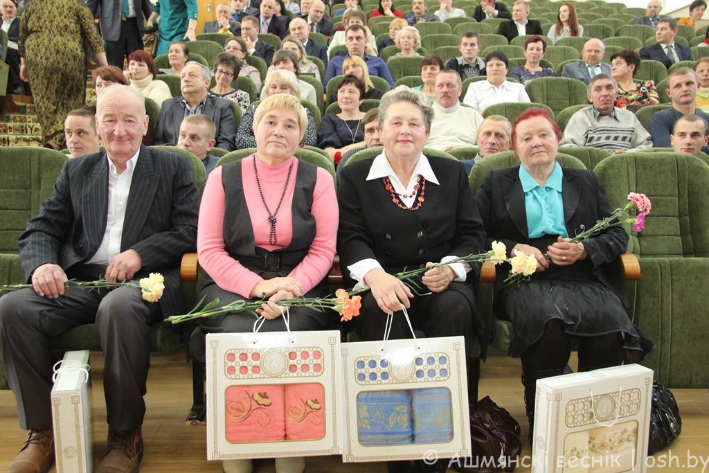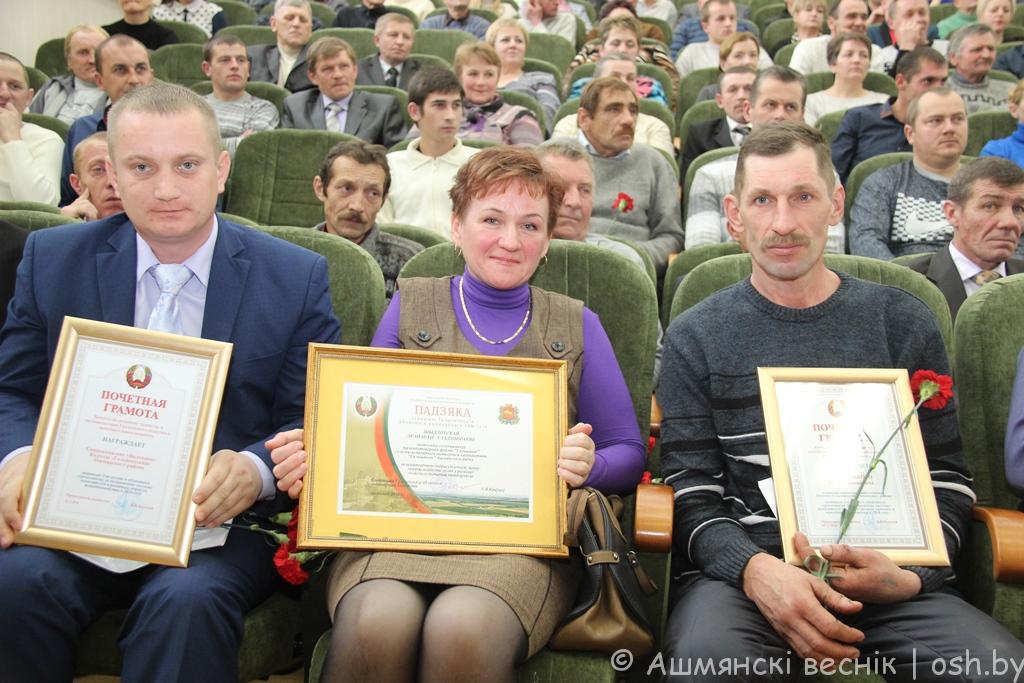 Присутствующие аплодисментами поприветствовали тех представителей района, которые днем ранее были награждены на областном празднике-ярмарке «Дожинки» в Вороново. Животноводческий коллектив СПК «Гольшанский» удостоен третьего места в своей номинации и стал победителям областного соревнования по развитию отрасли, ГУ «Ошмянская районная ветеринарная станция» признана лучшей в области, Почетной грамотой Совета Министров Республики Беларусь удостоен директор ОАО «Ошмянский мясокомбинат» Иван Лупиш. Награды получили начальник свиноводческого комплекса СПК «Гольшанский» Александр Гайдукевич, оператор машинного доения КРСУП «Э/б «Боруны» Тереса Пелецкая, зав. мастерскими КСУП «Краковка» Франц Можейко и оператор доильного оборудования того же хозяйства Виктор Болзан.