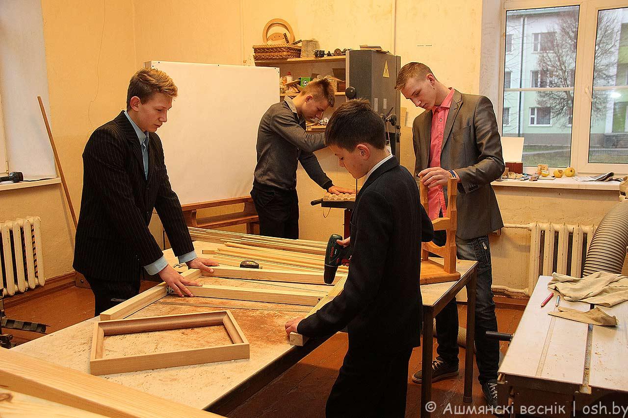 Настаўнік працоўнага навучання Сяргей Яўгеньевіч Малышаў расказвае, што тут наладжана сапраўдная дрэваапрацоўчая вытворчасць — ад бервяна да гатовага вырабу. Самае цікавае, што вытворчасць гэта безадходная — з маленькіх дошак ці драўляных кавалкаў дзеці прыдумваюць і робяць іншыя вырабы і крэатыўныя сувеніры. Напрыклад, сёння пачэснае месца ў працоўным кабінеце займае макет з ветракамі, аэрасані з электраматорам, спецыяльныя шчыткі па тэхніцы бяспекі ў мініяцюры, вырабы ў беларускім стылі, шпакоўня на чатырнаццаць кватэр… Дарэчы, апілкі таксама не выкідваюць, а пастаўляюць у «Гіпіку». Дзеці не толькі засвойваюць новыя тэхнікі, але і выкарыстоўваюць незвычайныя матэрыялы для сваёй творчасці. Напрыклад, старой мэблі і непатрэбным рэчам яны даюць другое жыццё.