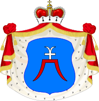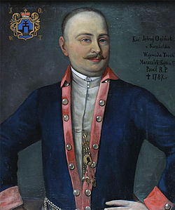 Герб жа роду Агінскіх у разглядаемы перыяд складаўся з дзвюх частак. У верхняй на чырвоным полі — выява Георгія Пераможцы, у ніжняй частцы на блакітным полі — герб «Агінец». Па меркаванні аўтара кнігі «Міхаіл Клеафас Агінскі» С.І. Верамейчыка, ніжняя частка больш ранняя, а брама да вайсковага намёта — сімвал таго, што шасцёра з князёў Агінскіх былі ваяводамі Вялікага Княства Літоўскага і Рэчы Паспалітай.