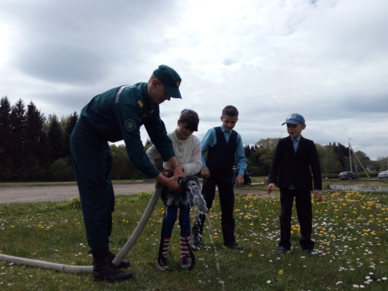 До начала официальной части мероприятия работники районного отдела по чрезвычайным ситуациям рассказали детям о пожарной аварийно-спасательной технике, оборудовании и снаряжении, используемом при ликвидации чрезвычайных ситуаций, а затем показали ребятам аварийно-спасательный инструмент. Дети имели возможность посидеть в кабине пожарного автомобиля и подать воду из пожарного ствола. В завершение экскурсии ребята получили обучающие брошюры «Геометрия безопасности».