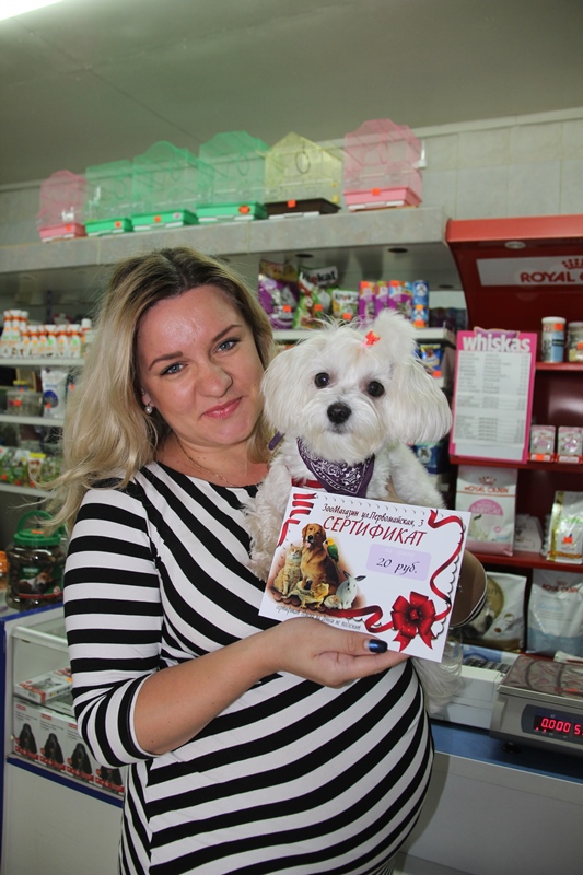 В минувшую среду приз нашел своих обладателей, собаке и ее хозяйке был вручен сертификат на сумму 20 белорусских рублей владельцами магазина, и победители сразу же приобрели необходимые для питомца товары.