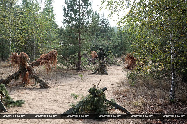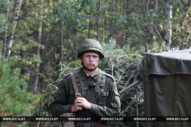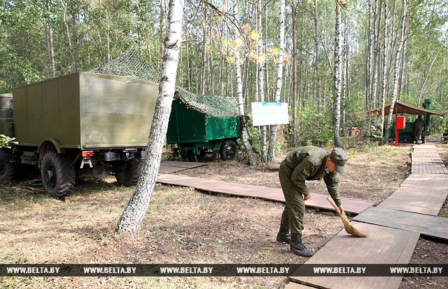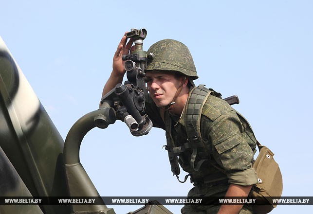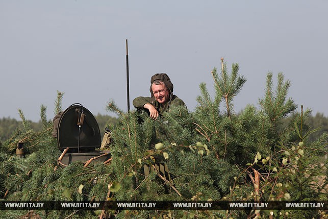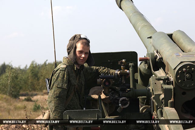 Когда подходили к дислокации 4-го тяжелого гаубичного артиллерийского дивизиона, то сразу и не скажешь, что здесь в лесном массиве развернулся палаточный городок, настолько все гармонично вписывается в окружающий пейзаж: специальные маскировочные сетки, укрытия с использованием живой растительности, грамотное использование местности и т.д. Огневые объекты дилетанту обнаружить не так просто, пока на них не натыкаешься вплотную. Это уже само за себя говорит об уровне готовности и проделанной работе по организации тылового, материально-технического обеспечения вооруженных сил двух стран. «Для развертывания такого дивизиона, если не спешить, потребуются сутки, но если нужно, то можно и быстрее», — пояснил заместитель командира дивизиона по идеологической работе Александр Залога.