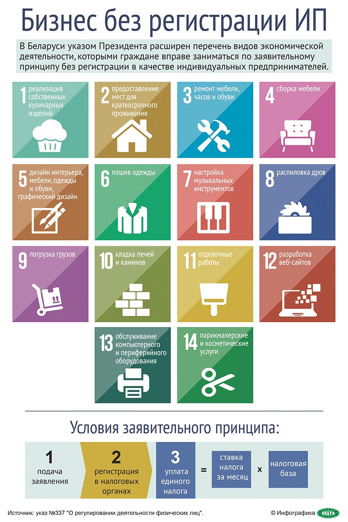 Президент Беларуси Александр Лукашенко 19 сентября подписал указ №337 «О регулировании деятельности физических лиц». Документом расширяется перечень видов экономической деятельности, которыми граждане вправе заниматься без регистрации в качестве индивидуальных предпринимателей при условии уплаты единого налога.