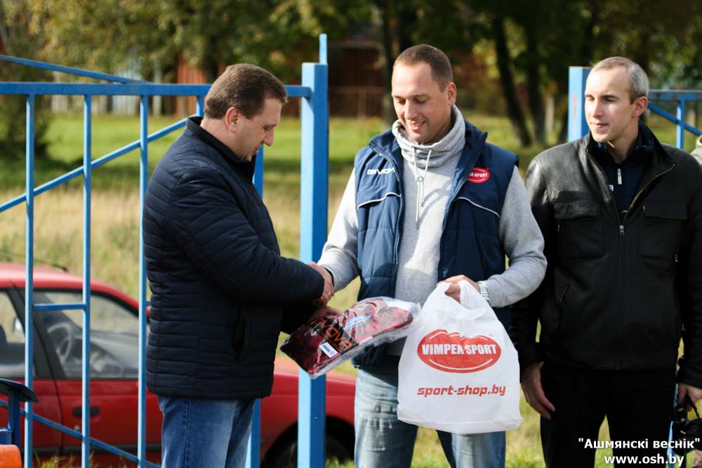 Перед началом игры команды поприветствовал председатель Ошмянского райисполкома Мирослав Саросек. Он пожелал нашим футболистам успешного выступления в чемпионате ( ФК «Ошмяны-БГУФК» не проигрывал 14 матчей подряд). Затем представители компании Givova (экипировка и инвентарь для футбола) вручили памятную футболку Мирославу Эдмундовичу. Именно в такой экипировке выступает наша команда.