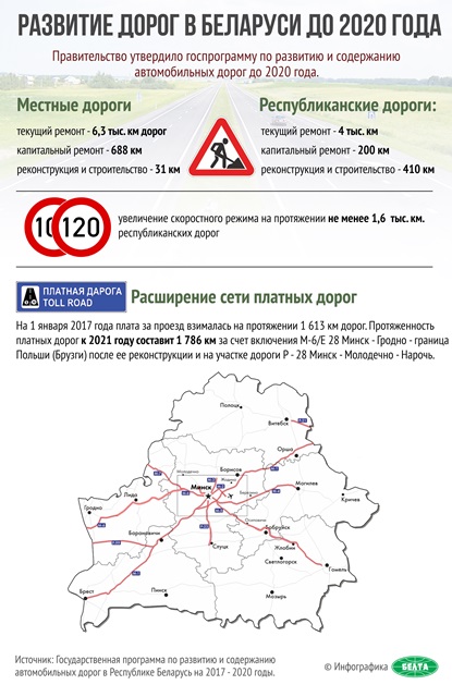 Сеть местных автомобильных дорог в Беларуси составляет почти 71 тыс. км, твердое покрытие имеют около 59,5 тыс. км из них. Для недопущения ухудшения дорожной сети правительством была принята соответствующая государственная программа на 2017-2020 годы, в которой определены подлежащие ремонту дороги. Оценка эффективности выполнения госпрограммы будет проводиться ежегодно.