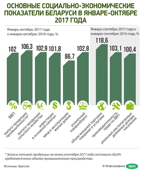 «В этом году наметился некоторый рост экономики, есть позитивные подвижки в ее ключевых отраслях. Внутренний валютный рынок устойчив. Сальдо внешней торговли положительное. Мы нарастили золотовалютные резервы, восстанавливаем объемы экспорта. Тем не менее оснований для самоуспокоенности быть не может. Экономика за 2015-2016 годы потеряла 6%. В этом году отыграли только 2%, что явно недостаточно», — отметил Александр Лукашенко.