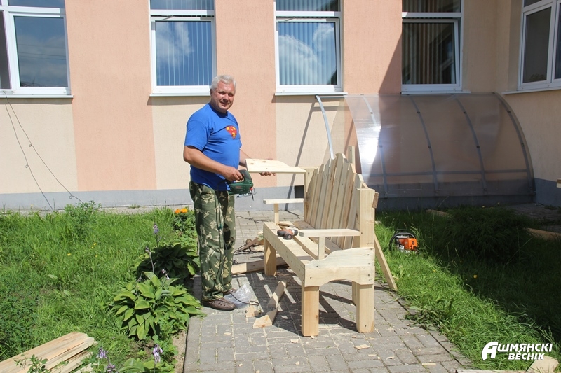 На днях на тэрыторыі школы з’явяцца таксама лаўкі — зараз іх вырабам займаецца рабочы па рамонце і абслугоўванні будынкаў і збудаванняў Іван Вінцаловіч. Разам з дворнікам Віктарам Гарадзецкім яны бяруцца за выкананне розных гаспадарчых задач.
