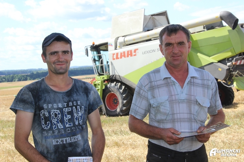 Бесспорным лидером на жатве является КСУП «Гольшаны». На счету гольшанских аграриев более 7 тысяч тонн намолоченного зерна. Чтобы пообщаться с механизаторами и поздравить победителей второй десятидневки на уборке, едем сразу в поле, где в самый разгар дня активное движение. И каждый участник уборочной кампании предельно четко знает и понимает свою задачу. Поэтому цепочка «поле-комбайн-зерноток» работает без сбоев. Из-за перелеска видны комбайны. Это экипаж Генриха Скаржинского, который на комбайне «Джон-Дир» за вторую десятидневку на уборке намолотил 730 тонн зерна, а сначала жатвы является вторым тысячником в хозяйстве. Общий его намолот с первых дней жатвы составляет 1172 тонны. Не отстает от своего коллеги и комбайнер Александр Сосновский. На комбайне «Мега-208» намолотил 573 тонны, а сначала жатвы — 863 тонны зерна. Лидерами на жатве за вторую десятидневку являются и другие комбайнеры хозяйства. С начала уборочной кампании комбайнер Сергей Радковский намолотил 716 тонн, а за десятидневку — 532 тонны. Почти на уровне идут коллеги-комбайнеры Юрий Гладкий и Олег Чимбор. Они работают на комбайнах марки «КЗС 12-18». Результат намолота у Юрия Гладкого за десятидневку — 430 тонн, а с начала жатвы — 599 тонн. У Олега Чимбора — 423 тонны и 630 тонн.