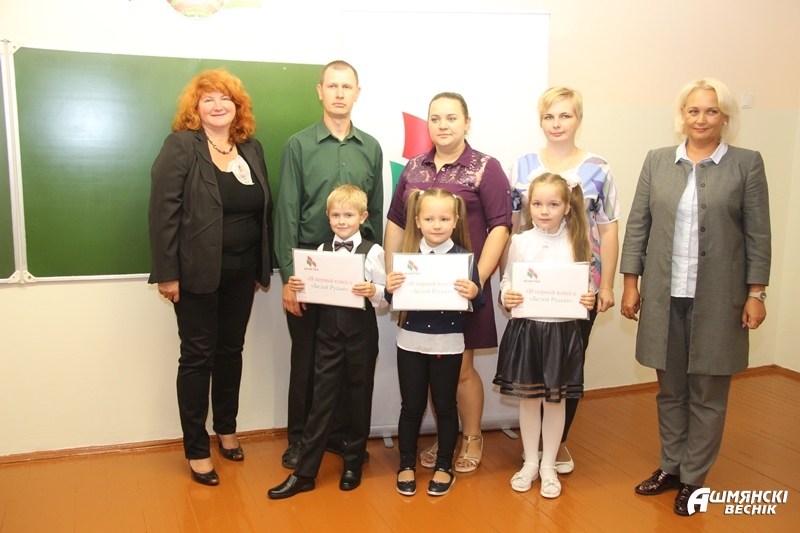 Первыми наборы первоклассника, наполненные школьными тетрадями, ручками, фликером и блокнотами, получили малыши из средней школы №1. На встречу Алексей, София и Анастасия пришли с родителями-учителями Сергеем Станиславовичем Пашкевичем, Марией Антоновной Бернат и Татьяной Казимировной Лугин.
