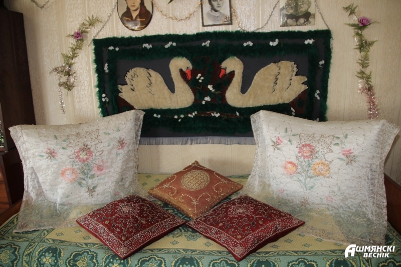 Скрыпнулі веснічкі, з дома пачуўся гучны брэх сабакі — маленькі Жулік выйшаў сустракаць гасцей, за ім следам, спрытна перасоўваючы кастылі, выйшла і гаспадыня — Марыя Ігнацьеўна Мадэкша. Гасцінна расчыніла для нас дзверы свайго ўтульнага куточка і запрасіла ў хату. У доме, як у казцы. Канапы і ложкі ўпрыгожваюць вышытыя сурвэткі, ручнікі, падушкі, фіранкі, дываны на сценах і саматканыя «ходнічкі» на падлозе, столь у кожным пакоі ўпрыгожана рознакаляровымі ўзорамі.
