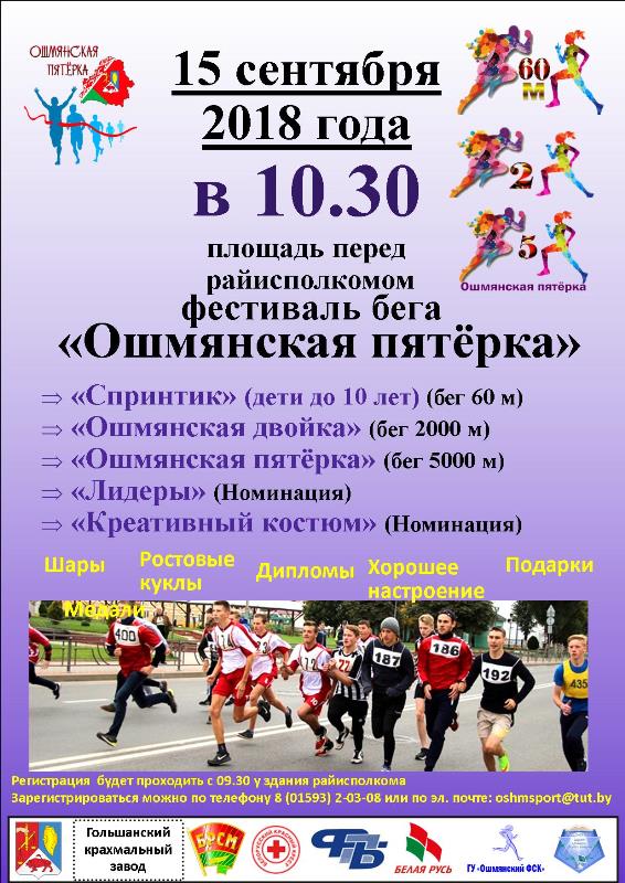 В центре города состоится фестиваль бега «Ошмянская пятерка». Все желающие могут проверить свои способности в забегах на 2 и 5 км. Примером приобщения к здоровому образу жизни станут руководители учреждений, предприятий и организаций Ошмянского района в забеге «Лидеры». А для самых маленьких- дистанция «Спринтик».