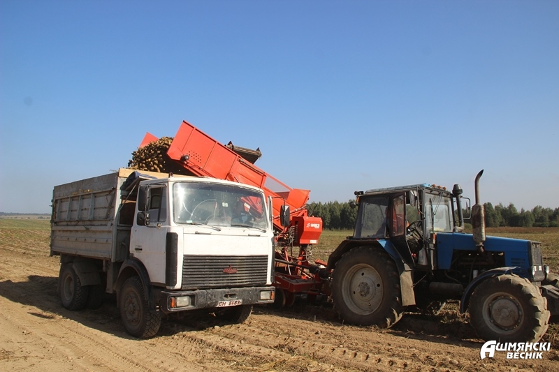 Картофелеуборочный комбайн под управлением Михаила Марачевского и его помощника Марьяна Войшнаровича целый световой день в поле, «откусывает» в рабочий день около 3-5 гектаров «второго хлеба» от всех 50 гектаров. Нагрузка высокая. Бригада женщин-полеводов — Вера Алексеева, Наталья Омельян, Валентина Шаверда, Татьяна Нагель следят, чтобы в комбайн не попадали камни, некачественный картофель и сорняки. Урожай не хуже прошлогоднего, и полеводы стараются работать быстро, остановки короткие, и только для того, чтобы отгрузить собранный урожай. В облаке пыли от впереди идущего комбайна, трактора и машины один за другим вывозят урожай в подготовленное хранилище. На транспортировке его от комбайна задействован водитель хозяйства Сергей Матиевский, в частном порядке своим транспортом помощь оказывает Иван Илюкович. Часть урожая картофеля, а это сорта, в основном, «Скарб», «Манифест», «Янка» заложат на хранение, другую часть реализуют зимой в торговой сети.