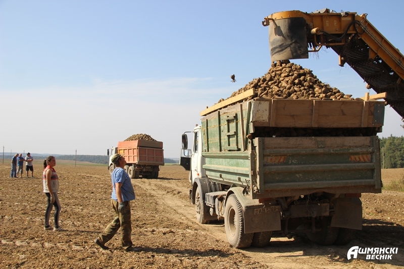 В КСУП «Гольшаны» убрано пока чуть больше 50 гектаров из 236. Урожайность корнеплодов — 500 центнеров с гектара. На свеклоприемный пункт свезено более 2,7 тысячи тонн. В транспортировке урожая возле деревни Коробы активно помогают водители МАЗов автопарка №13. На загрузочном комбайне после уборки зерновых трудится механизатор Петр Познанский. Полеводы Геннадий Докурно и Екатерина Давидович следят за чистотой поля, чтобы весь собранный урожай отправлялся в кузова машин.