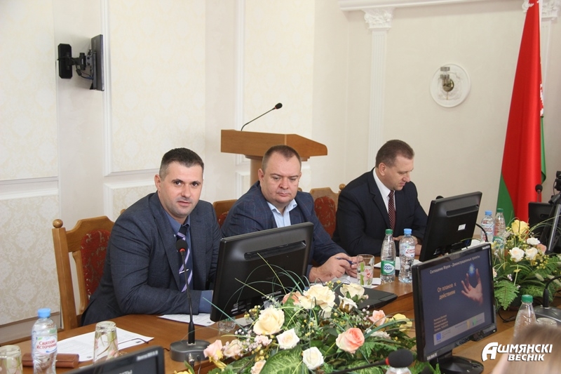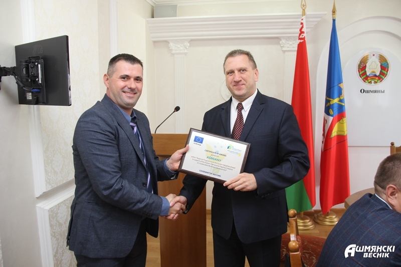 Во время встречи с экспертами команды поддержки программы «Соглашение Мэров — демонстрационные проекты» председателю Ошмянского райисполкома Мирославу Саросеку был вручен памятный сертификат о победе в конкурсе грантов. Эксперты и координаторы проекта провели презентацию реализуемой программы, а также познакомили с возможностями участия в других проектах. Руководство района, в частности, заинтересовала тема уличного освещения.